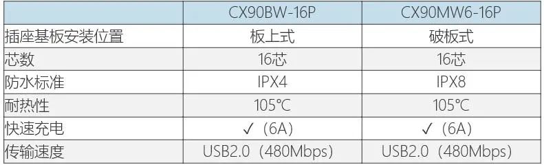 “CX90MW6-16P”是將連接器嵌入基板安裝的破板式類型,由于沒有安裝高度,有助于設備的低薄化。此外,通過在內部使用獨特結構的零件實現了高基板固定強度,結合外殼所具備的螺絲孔,在安裝后進行螺絲固定,可以進一步提高固定強度。作為對環境的特性,實現了IPX8的高防水性能?!癈X90BW-16P”和“CX90MW6-16P”都具有105℃的高耐熱性,并且還支持6A高電流的高速充電。