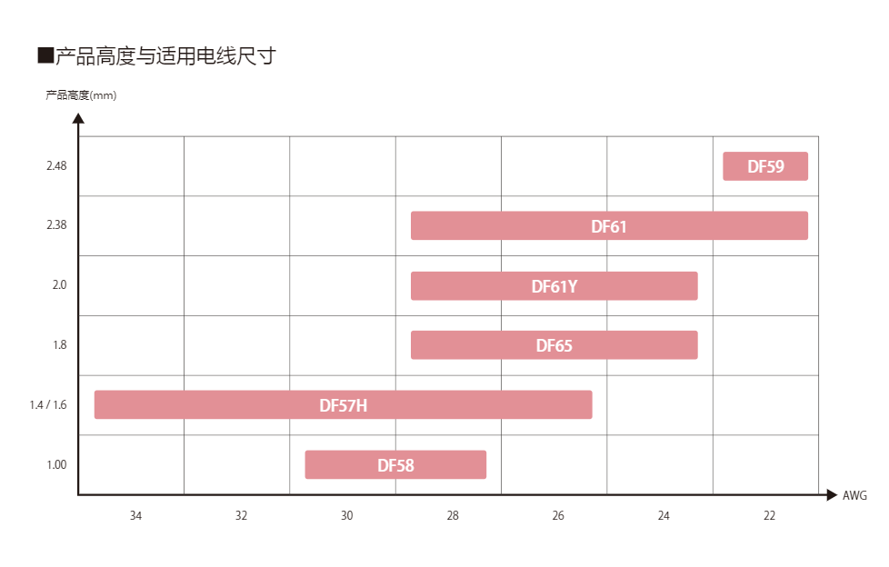 支持28 AWG,高度1.0mm,是業內最低薄級別的小型連接器。DF58系列是SnapBee中在低薄構造和窄間距方面最具優勢的產品,有助于實現機器設備的小型化。較大的有效嵌合長度可以實現穩定的連接。